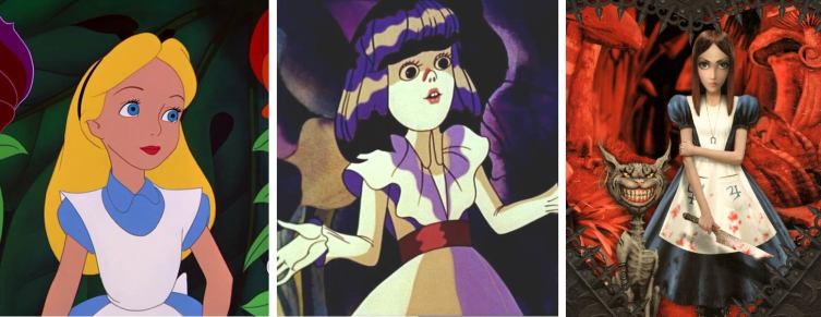 Вообще же спектр изображений героини Кэрролла весьма широк — от миленькой блондиночки с котёнком из диснеевского мультфильма до готичной брюнетки с окровавленным ножом из компьютерной игры «American McGee’s Alice».