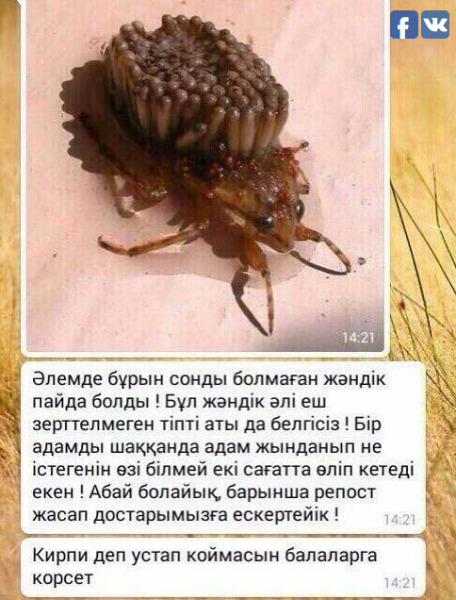 К примеру, на паническое сообщение о жутком жуке-убийце отреагировал эксперт-энтомолог. Жук оказался водяным клопом, не представляющим опасности для человека. Что уж говорить о том, что Казахстан даже не является его средой обитания.
