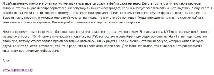 Есть еще один способ уберечься от лживых новостей — платная подписка на проверенные издания. Его мне подсказала Оля Морозова из рассылки Expresso. Приведу ее слова: