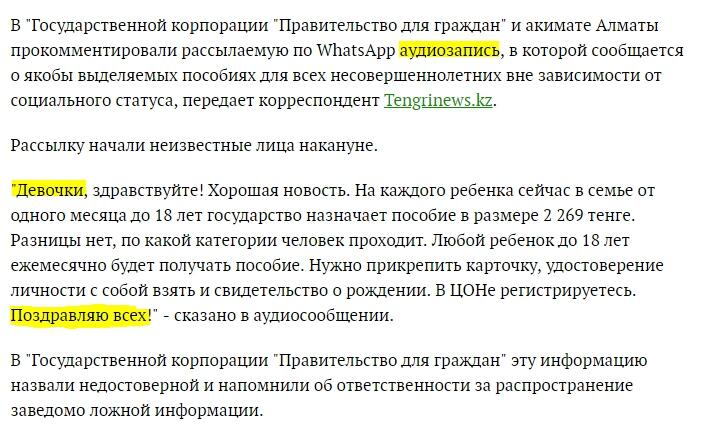 Из недавнего вспомнилось, как добрый аноним пообещал всем казахстанцам пособие на детей. Это тоже фейк, который облетел все казахстанские мессенджеры и вызвал море домыслов и гигантские очереди в ЦОНах.