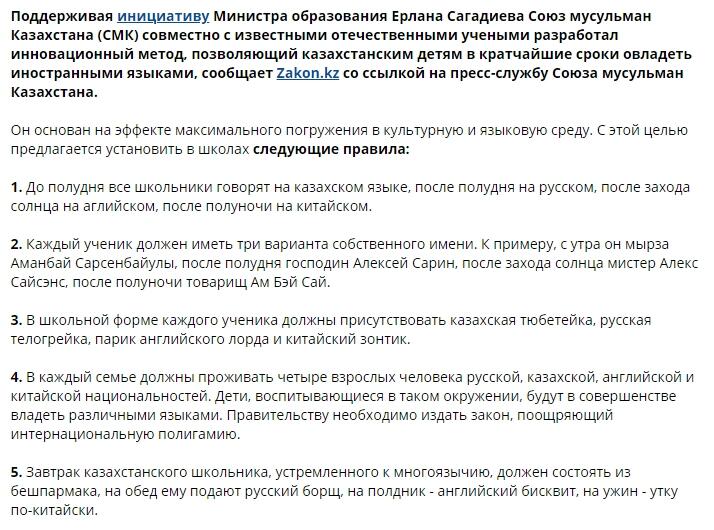 Или автор частенько пишет сатирические материалы, которые всегда вызывают резонанс в обществе. К примеру, новость о налогах на секс стала настоящей бомбой в Казахстане, и не каждый обратил внимание, что предложение это поступило от Главы Союза мусульман Казахстана Мурата Телибеков, известного абсурдными высказываниями на злобу дня.