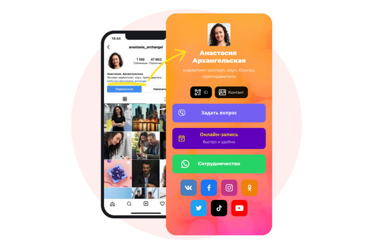 Кроме того, социальные сети — это отличный способ рассказать больше о себе. Делитесь полезными ссылками, например, на свои аккаунты в других соцсетях, интернет-магазин или же на портфолио с работами. Всю эту информацию можно собрать на мультиссылке — мини-сайте для соцсетей. Быстро и удобно создать мультиссылку можно в сервисе Nethouse. id, это бесплатно.