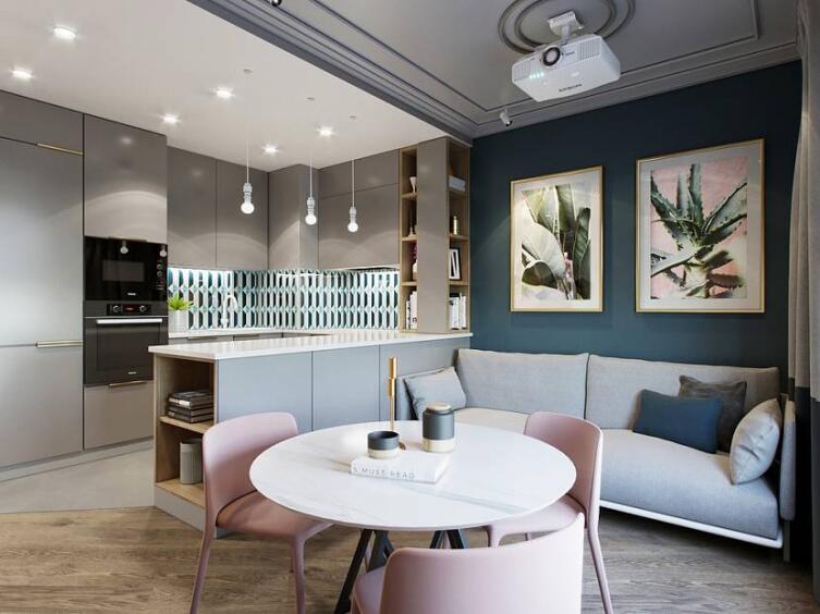 Что же касается формы обеденного стола, то отдайте предпочтение круглым моделям. Они занимают мало места и смотрятся очень уютно. Многие заказчики ремонта в Domeo хотят включить в дизайн кухни-гостиной 20 кв. м. угловой диван, не учитывая, сколько свободного пространства он «съест». Более практичным решением будут диваны, где угол создается за счет последней вытянутой секции. Можно выбрать и модели с приставными конструкциями, которые будут исполнять роль журнального столика. Помните, что в маленьких помещениях стоит делать акцент на многофункциональные изделия.