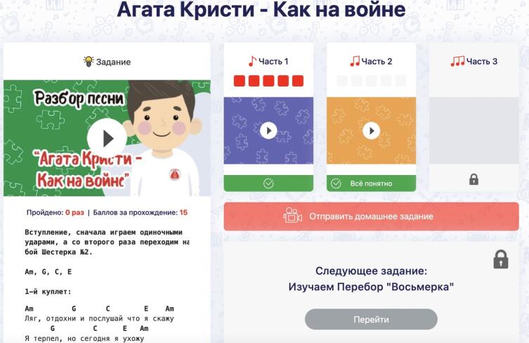 Исполнение каждого задания записывается на видео и отправляется преподавателю на проверку. После проверки преподаватель либо дает рекомендации о том, что следует исправить в исполнении, либо открывает доступ ученику к следующему уроку.