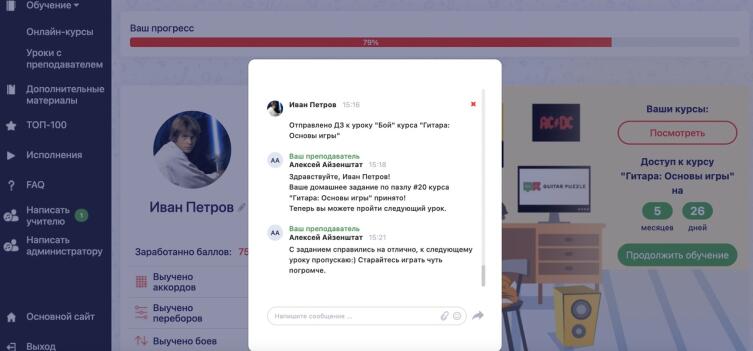 - Обратная связь. Каждый ученик после прохождения урока и выполнения домашнего задания получает обратную связь от профессиональных педагогов. Преподаватели помогают учениками исправить неточности в исполнении и дают ценные советы. Таким образом ученики сразу учатся играть правильно и не заучивают допущенные ошибки.