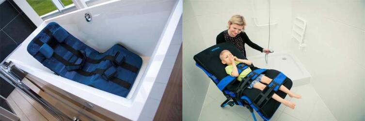 Это детское кресло-туалет, но с возможностью трансформации в приспособление для купания детей с ДЦП. В частности, можно докупить присоски и, сняв сиденье, установить его на дно ванны. Сиденье имеет абдуктор и ремни для фиксации ребенка в сидячем положении, что позволяет не только быстро выполнять гигиенические процедуры, но и подолгу купаться.