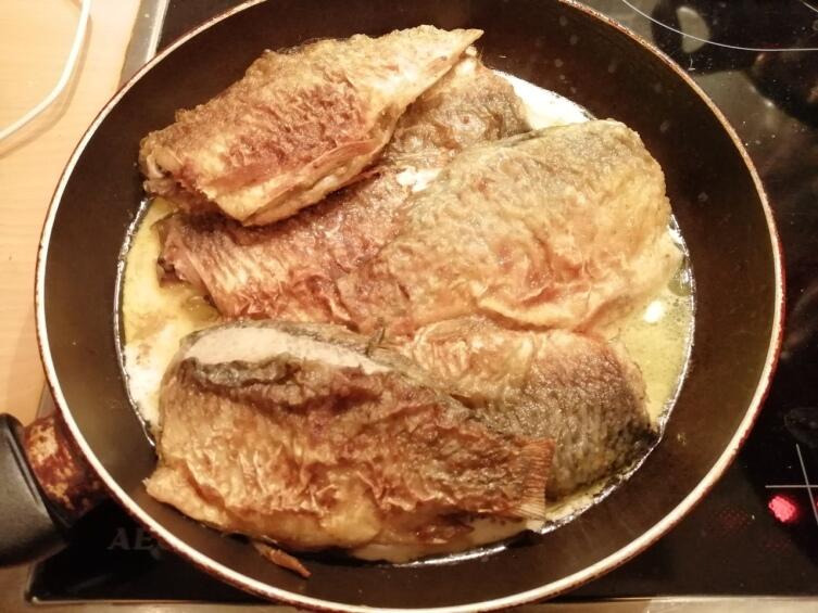 Растапливаем на сковороде сливочное масло… Чтобы оно не пригорало, добавляем в него совсем немного (несколько капель) растительного. После того, как масло, растопится, а сковорода накалится, убавляем огонь с максимума на что-то промежуточное между ним и средним уровнем. Огонь должен быть приличным, но не настолько сильным, чтобы рыба у нас пригорела. Масло растопилось, сковорода нагрелась? Опускаем в неё запанированную в муке рыбу. Две-три минуты на одной стороне, столько же — на другой.