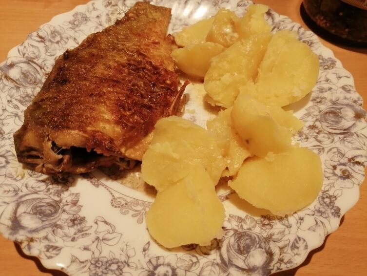 Лучшего гарнира к жаренным в сметане карасям, чем отварная картошка, как на мой вкус, нет ничего. А если её полить тем соусом, что у нас в сковородке, да посыпать рубленным зеленым лучком…