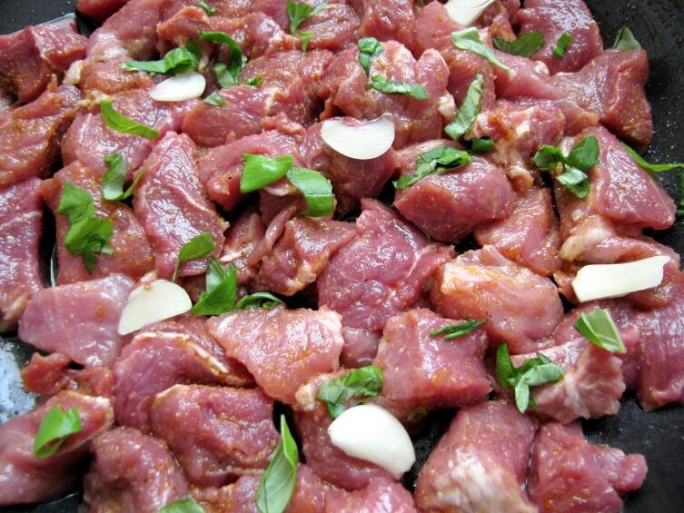 Для начала берем килограмм бескостной свинины. Разделываем его на небольшие (сантиметра по два-два с половиной) порционные кусочки.