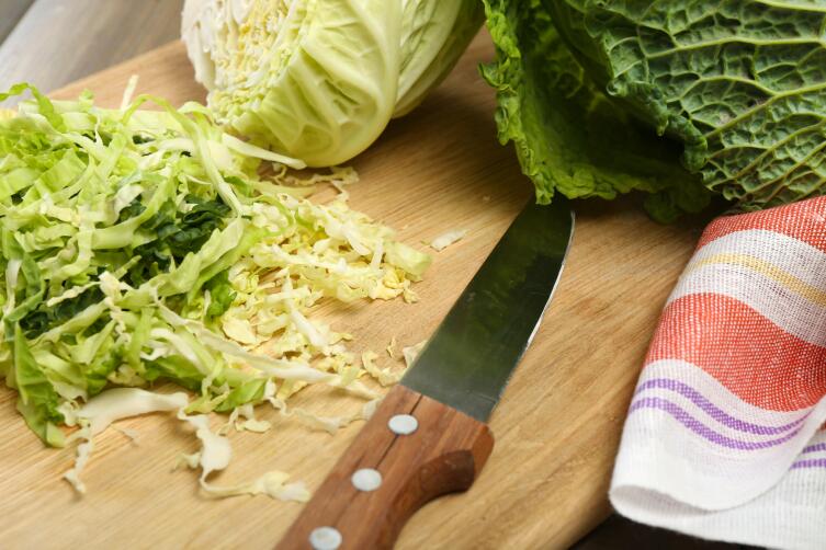 После того как все нужные нам специи оказались в казане, закладываем туда тонко пошинкованную свежую белокочанную капусту. Присаливаем её, убавляем огонь до среднего, накрываем казан крышкой и несколько минут ждем.