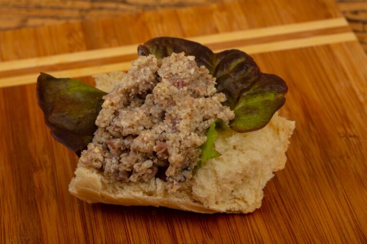 На самую красивую тарелку в доме выкладываем подушку из луково-яблочного тартара, на неё сам форшмак, рядышком — поджаренный бородинский хлебушек. Пару перышек зеленого лука сверху лишними не будут. И зовем всех, до кого можем докричаться, на дегустацию.