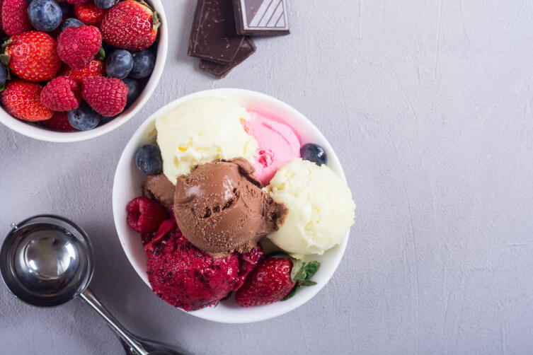 Детей наверняка порадует оригинальное и полезное лакомство из запеченных фруктов и ягод с мороженым. Для этого летнего рецепта берут такие ингредиенты: