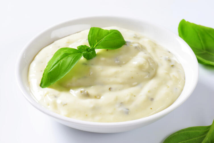 На 0,5 литра соуса возьмите 2 куриных желтка, добавьте по 7 г соли и сахара, 25 г горчицы, 10 мл лимонного сока и, тонкой струйкой вливая растительное масло (300−350 мл), взбивайте погружным блендером до состояния майонеза. Если соус получился слишком густым, подлейте столовую ложку холодной воды.