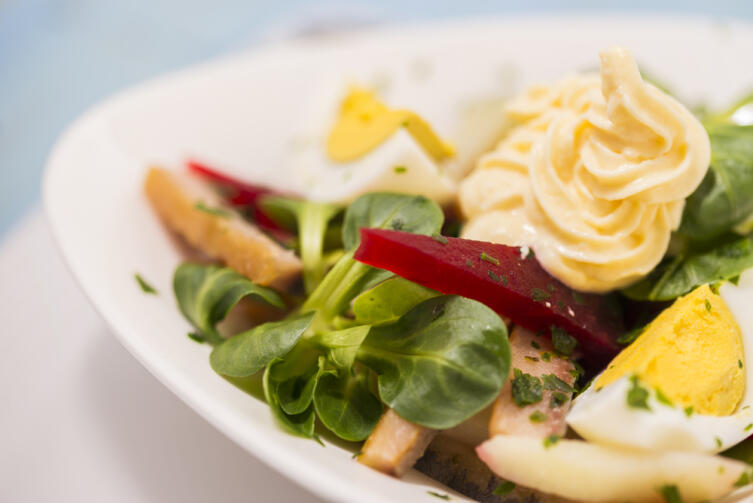 Чтобы свекла не окрасила другие продукты, непосредственно перед подачей на стол выкладываем в салатник нарезанные картофель, свеклу, яйцо и сельдь и очень осторожно перемешиваем, сверху украшаем зеленью валерианы и майонезом.