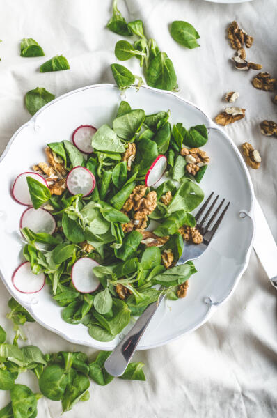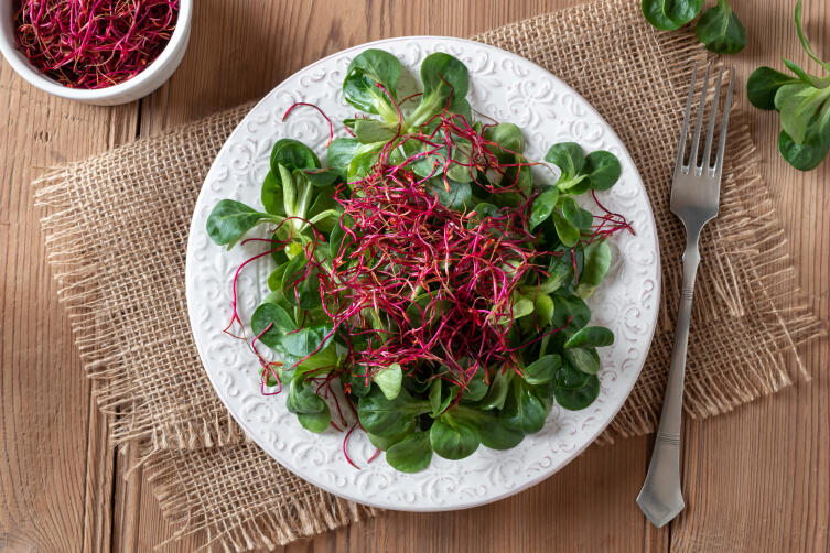 Посыпаем свеклу зеленью валерианеллы, поделенным на дольки ядром 1 грецкого ореха и ½ чайной ложки кунжута.