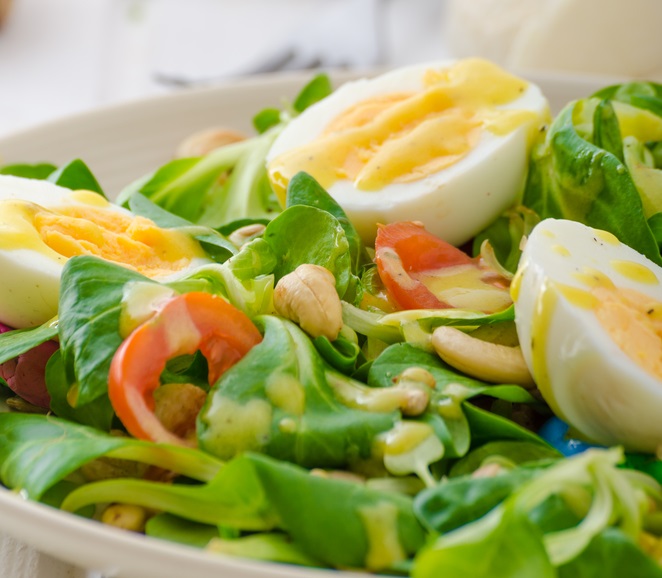 Отварить 2 перепелиных яйца (можно заменить 1 куриным) и порезать на половинки. Добавить таким же образом нарезанные помидоры черри и порванную на кусочки горсть зелени валерианы, заправить заправкой из предыдущего рецепта и посыпать кедровыми орехами и кешью.