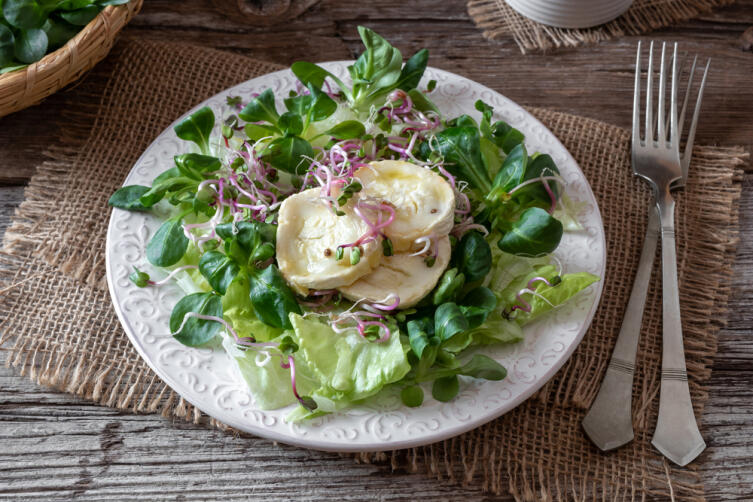 Яйца можно заменить козьим сыром, либо острым сыром с голубой плесенью, получается невероятно вкусно. На фото вариант оригинального салата из валерианы с козьим сыром и тертой свежей редькой: