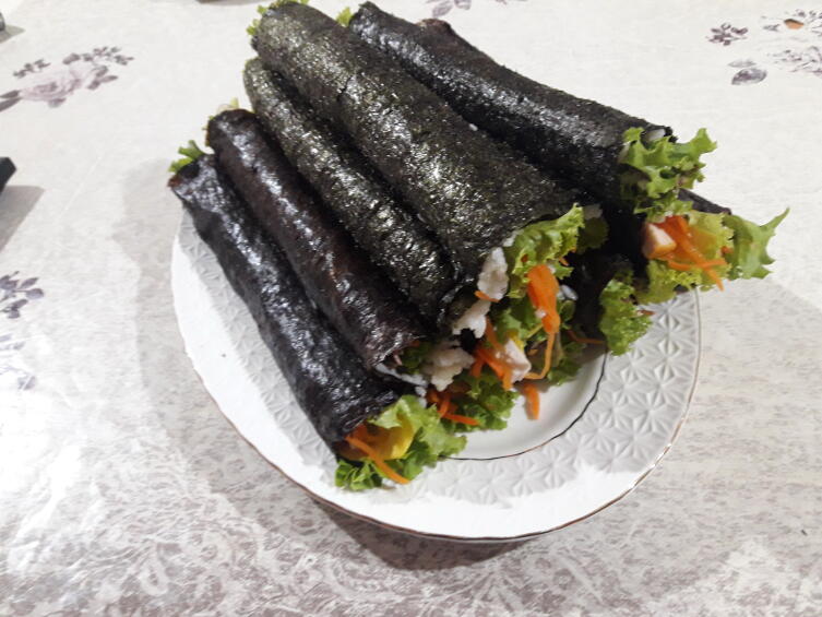 В начинку кладут листья шпината и зеленого салата, маринованный дайкон, кимчи, свежие овощи — огурцы, сладкий перец. Я пробовала добавлять даже помидор — очень интересный вкус.