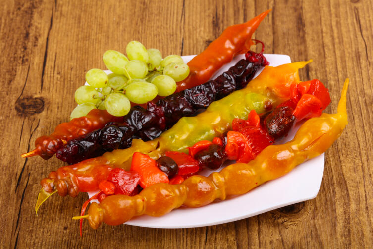 Чурчхела. Традиционную грузинскую сладость готовят из винограда, орешков и муки. Можно добавлять изюм. Всё нанизывают на нитку, окунают во фруктовый сироп (патоку), дают схватиться. Это божественно вкусно!