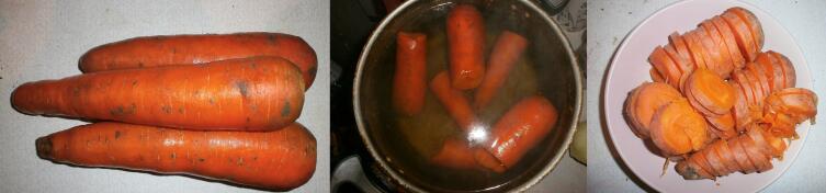 Сначала отваривают предварительно очищенную и промытую морковь в течение примерно 40 минут — до того, пока морковь не размягчится. Это контролируется свободным прокалыванием ножом или вилкой. Начальный объем воды в кастрюле примерно 1,5 литра.