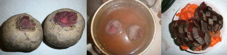 Отваривают и свеклу также в течение 40 минут — до готовности. Трут теркой или разрезают на тонкие ломтики. Также отваривают репчатый лук, предварительно очистив его и разрезав на дольки, примерно в течение 25−30 минут. Необходимо регулярное перемешивание.