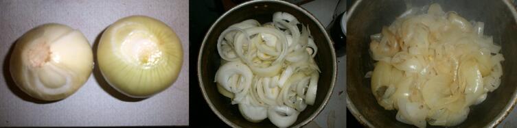 Лук отваривают до размягчения и образования желтой корочки. Из всех рассматриваемых в рецепте ингредиентов именно репчатый лук в процессе отвара наиболее теряет в объеме. Из трех луковиц в результате в кастрюле остается всего 200−300 г. Но этого для салата достаточно. Отварной репчатый лук сохраняет многие из полезных свойств, но теряет «резкость» послевкусия и уже не провоцирует «слезу», как свежий при нарезке.