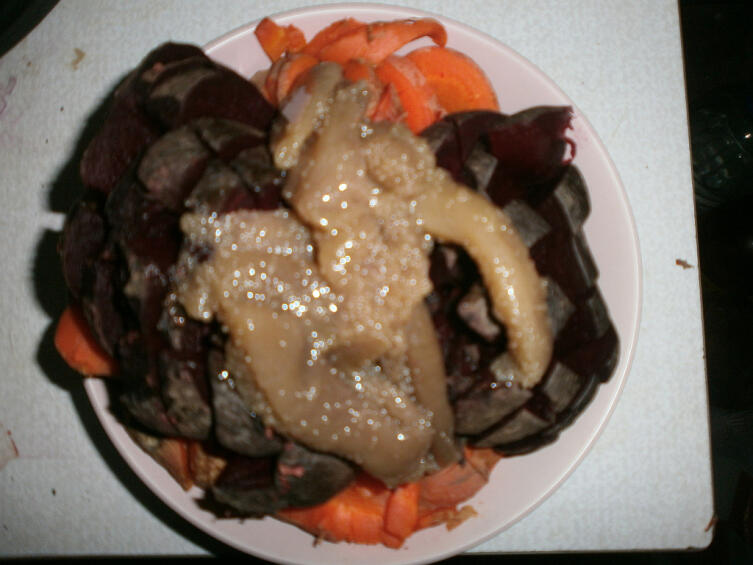 Также удивительный вкус придаст готовому салату из отварных лука, моркови и свеклы добавление меда — потребуется 2−3 столовые ложки. Когда нет аллергии на продукты из меда, это прекрасный способ подсластить готовое блюдо. Вместо меда также можно применить его субпродукты — пыльцу и пергу.