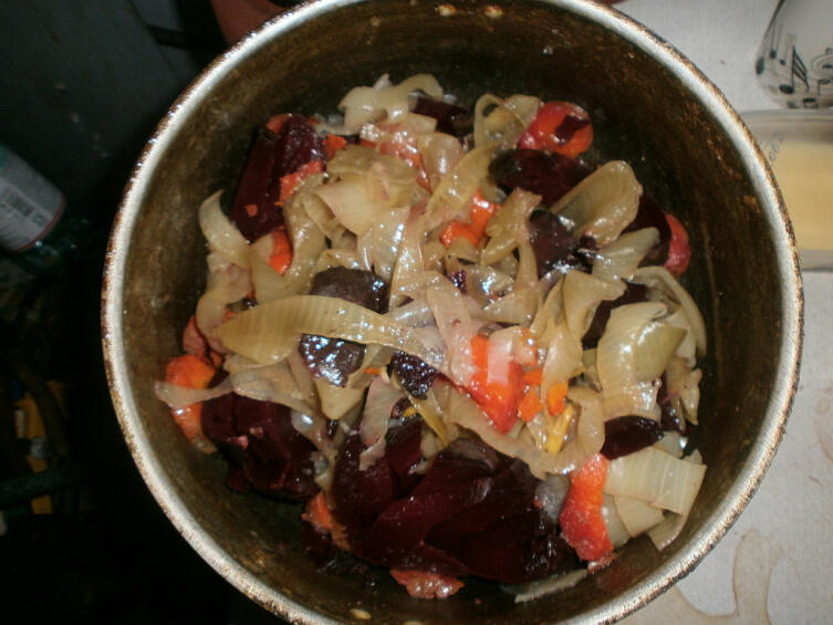 Для дополнительной энергии отвар от свеклы и моркови можно не утилизировать, а выпивать горячим. Лук при отваре выделяет сок, поэтому предварительно смазывать сковороду или кастрюлю маслом или жиром не требуется. Луковый отвар также полезен для организма и его можно выпить.