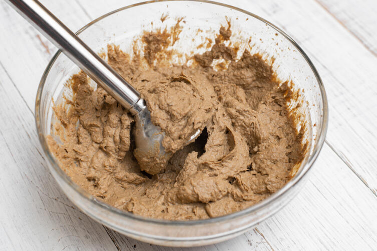 В мясорубке 2−3 раза (а если понадобится, то и больше) измельчите всю печень и все содержимое сковородки (если не очень много масла; а если все же много, просто отдельно слейте его, а все остальное измельчите), сливочное масло (если планируете придавать паштету форму рулета, отложите половину масла, а вторую — в мясорубку) и зелень петрушки.
