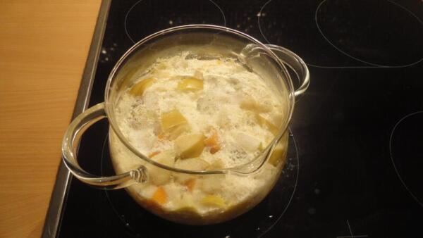 Как молоко станет горячим (вот-вот закипит) — только тогда! — осторожно, не разбрызгивая, засыпаем в него смесь порезанных тыквы и яблок. Закипит, убавляем и на медленном огне варим, пока тыква не помягчеет. Это минут 15−20.