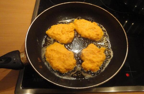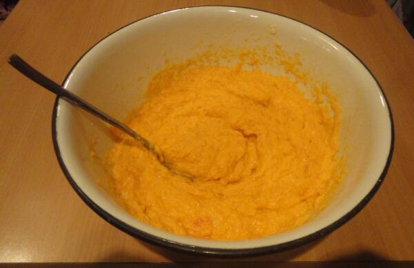 Сколько их там у нас? Стакана полтора? Тогда добавляем к ним стакан просеянной через ситечко пшеничной муки, стакан кефира, 2 яйца, столовую ложку сахара, пол чайной ложки соли, ¼ ч.л. соды и замешиваем тесто на оладушки. Тыквенные!