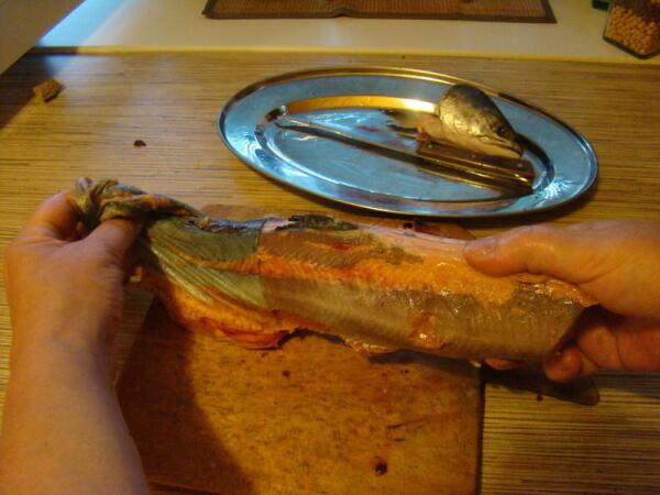 Итак, приступим. Горбуша нужна обязательно глубокой заморозки — неважно, тушка это будет или филе. С филейками возни меньше, вернее, нет никакой возни. Если же вам досталась целая рыбина, как и мне в этот раз, то ее следует чуть-чуть разморозить для того, чтобы снять кожу. Эта изуверская процедура происходит достаточно легко, необходимо лишь отрезать голову и слегка подцепить шкурку в месте «отреза» — снимается «чулком» с подмороженной тушки. Готовить вместе со шкурой не рекомендую — устанете потом отплевываться от чешуи.