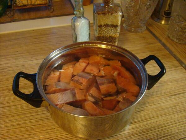 Следующий этап — опустить подготовленные кусочки горбуши в тузлук. На сколько? В исходном рецепте рекомендованное время составляло 5−8 минут. Отчего-то мне этого показалось мало, и я всегда выдерживаю не менее получаса. Ни недосола, ни пересола не наблюдалось ни разу.