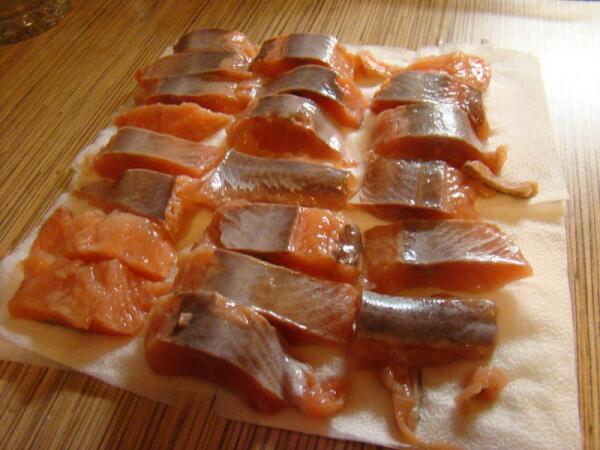 Дальше разделываем рыбу на филе любым известным вам способом. Опять же в состоянии «подмороженности» хребет и кости отделяются без проблем и ненужных потерь. Чистые филейки быстро нарезаем на кусочки произвольной величины — практика показывает, что оптимальная их ширина примерно два сантиметра.
