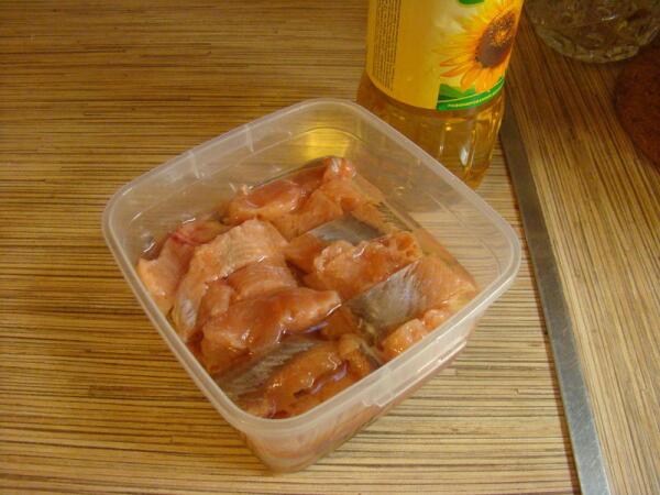После того как истекут положенные минуты, достаем рыбку, слегка подсушиваем салфеткой и укладываем в удобную для хранения в холодильнике емкость (например, в пластиковый контейнер), после чего заливаем растительным маслом. Я масло в соленой рыбе не очень люблю, поэтому лишь душевно сбрызгиваю. Но следует помнить, что если масло покрывает рыбу полностью, то хранится она значительно дольше. Можно добавить любимые специи, но по мне, и так хорошо.
