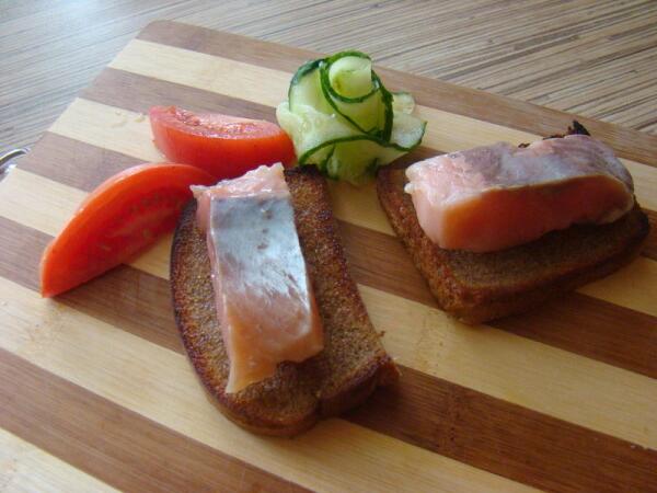Форель, сёмга, кижуч и прочие благородные лососи в те давние времена обладали партийной, профсоюзной и прочей кастовой принадлежностью, а в широких массах известны были лишь по «Книге о вкусной и здоровой пище» выпуска 50-х годов. На праздничных столах обычных граждан была представлена кета — это если повезет, а чаще горбуша, не многим отличавшаяся от любимой мной воблы — тоже сухая и чрезвычайно соленая. У нас в семье ее подавали так: нарезали тонкими ломтиками прямо с кожей и хребтом, нарядным веером укладывали на плоской тарелке и украшали дольками лимона.