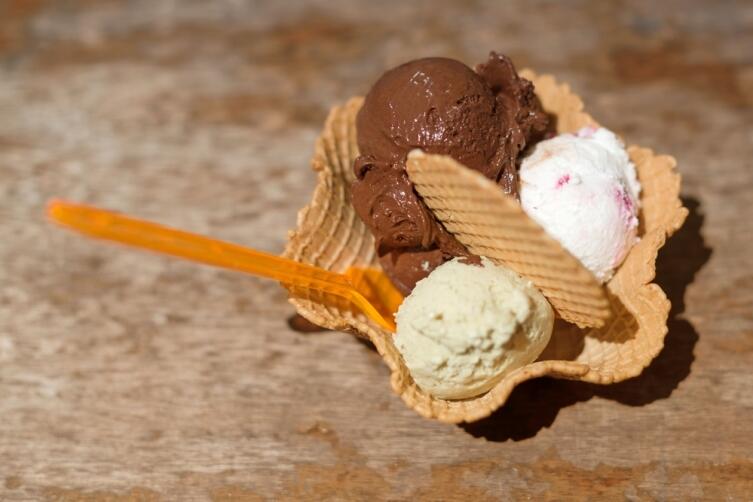 И вот когда мороженое застыло, минут за 10 до подачи, достаем наши формочки — воздушные шарики из холодильника. Даем им чуть нагреться, при комнатной температуре отойти от холодильного холода и протыкаем воздушный шарик. Он, естественно, лопается, сдувается, и остается только шоколадная формочка. В которую мы с удовольствием накладываем столько шариков нашего ароматного домашнего мороженого, которое мы только в состоянии сегодня съесть.
