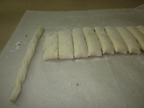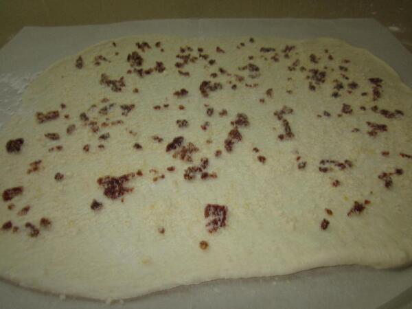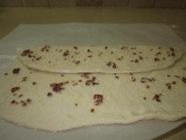 Мысленно делим раскатанный тестяной прямоугольник на три равные части по широкой стороне и сворачиваем его, положив верхнюю треть на среднюю. Присыпаем оставшейся начинкой, ее тоже настойчиво и ласково вдавливаем в тесто и накрываем оставшейся нижней третью. Вся начинка у нас оказывается внутри. Мы тесто распределяем поровнее и придавливаем. Остается только порезать начиненную заготовку на кусочки по 1,5−2 см шириной и свернуть их в спиральки, одновременно чуть растягивая тесто в длину.