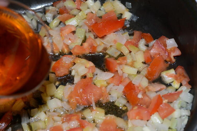 Перед варкой в буйабесе овощи обязательно предварительно обжариваются. Затем добавляем стакан белого вина и помидор.