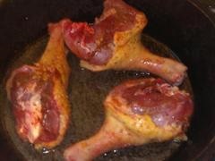 Приготовление. Конечно, птица должна быть осмолена. Если где-то остались пеньки, то прибегаем к женским хитростям и удаляем их пинцетом. Хорошенько вымыть, обсушить и порезать на куски. Можно попросить добытчика разрубить, пусть почувствует свою мощь. Потом обильно посыпать приправами. Посолить при этом немного, так как потом еще будет соевый соус, а он сам по себе соленый.