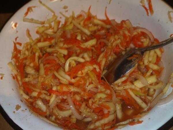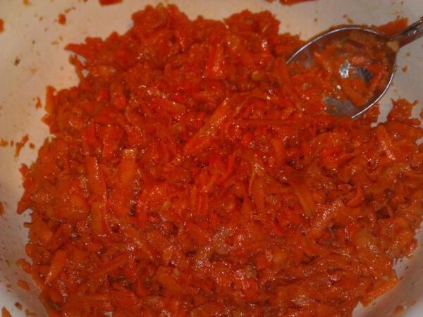 Вылить масло на сковородку, выложить порезанный лук и жарить его на слабом огне до полуготовности. Важно не поджарить сильно, лук должен помягчеть и остаться белым, не коричневым, когда он поджаренный. Затем вынуть шумовкой лук и горячим маслом, напитанным ароматом недожаренного лука, залить морковку и опять все хорошо перемешать, поставить в холодильник.