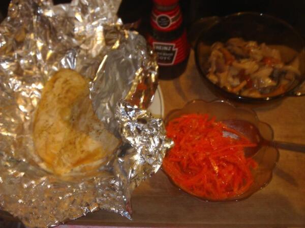 Приготовление. Грудку я запекла в духовке, так она получилась ароматнее. Но можно и отварить. Натерла специями, солью, обложила пластинками чеснока, завернула в фольгу и отправила в духовку на 1 час, при температуре 180 градусов. Картофель отварила, вот и все сложности.