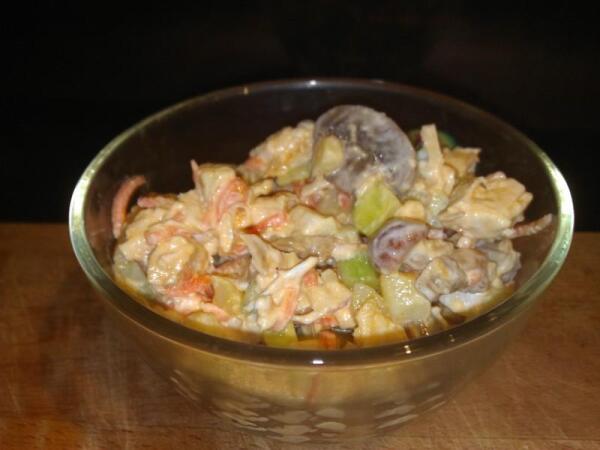Порезала грудку и картофель кубиками. Крупные грибочки тоже надо порезать. Все смешала, добавила корейскую морковку и еще раз перемешала. Перед подачей на стол в салат можно добавить мелко порезанный свежий огурчик, сбрызнуть соевым соусом и заправить майонезом.