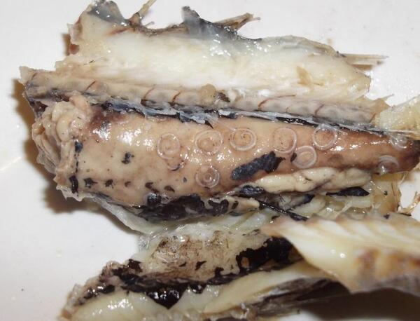 На представленных фото можно увидеть закрученные спиральками белые нити — это гельминты. То есть паразиты, живущие во внутренностях рыбы. Кладь этих червей может сохраняться в кипящей воде.