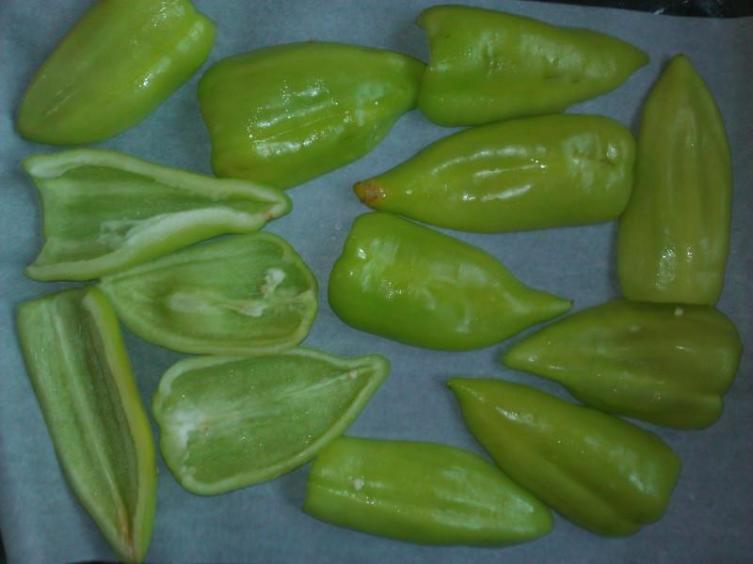 Первым делом запечем перцы. В идеале, если вы живете в собственном доме и у вас есть мангал, то вперед к нему и подрумяньте перчики там. Но если живете в квартире, не беда, перцы почистим, вымоем, разрежем на половинки (если крупные — на четыре части), высушим. Разложим на противне и смажем растительным маслом с помощью кисточки. Запечем до румяной корочки где-то полчасика при температуре 180−200 градусов.