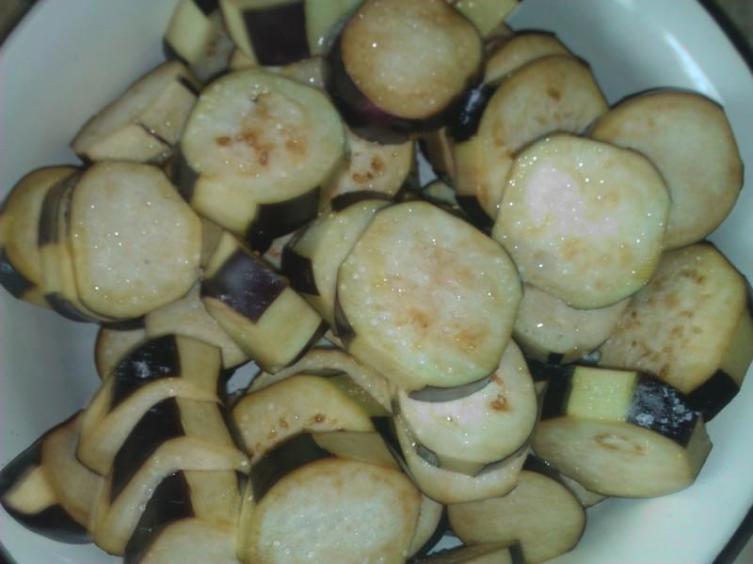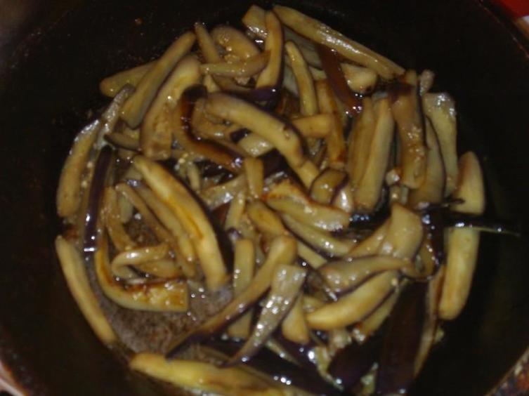 Да, ингредиентов много, но все это мелочи жизни, блюдо того стоит. Для начала вымоем и просушим баклажаны и все остальные овощи, какие надо — почистим. Нарежем синенькие сначала на пластины толщиной 1−1,5 см, затем каждую пластину — на длинные ломтики, и их же порежем пополам поперек, так будет удобнее есть их в готовом виде. Посыпать баклажаны солью, через 30 минут промыть и хорошо отжать.