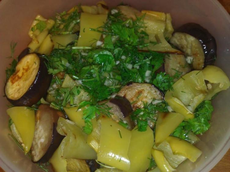 Самое трудное позади, осталось все сложить слоями и залить маринадом. На дно эмалированной или стеклянной посуды (или просто пластикового контейнера) сложить слоями: баклажаны, зелень с чесноком, перцы, зелень с чесноком — и так по порядку до того момента, как все будет сложено. Залить маринадом.