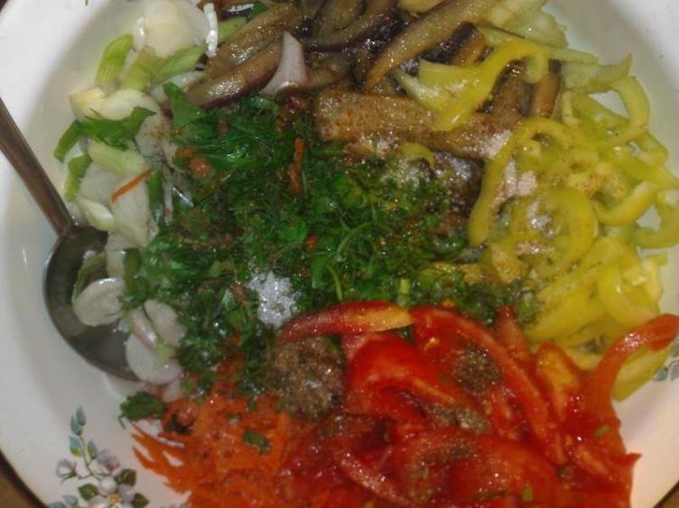 Уже отжатые баклажаны обжарить, помешивая, около 10 минут. Выложить в емкость, в которой собираетесь готовить салат. Добавить туда все остальные нарезанные ингредиенты, лук, морковь, перец и зелень, перемешать, выдавить чеснок, добавить сахар (можно заменить ложкой меда), немного соли, соевый соус, уксус, кориандр и остальные приправы.