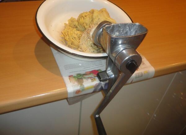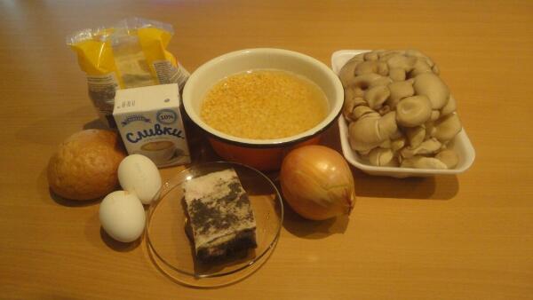 Пока возились с горохом, луком, чесноком, вымачиванием хлеба, грибы успели остынуть. А это — верный признак того, что пришло время собирать мясорубку. Собрали? Теперь пропускаем через неё обжаренные с луком грибы, отваренный горох, головку свежего (сырого) лука, чеснок, вымоченный в молоке белый хлеб (батон). Для того, чтобы котлеты были и сытнее, и сочнее, я в перекручиваемый на мясорубке продуктовый ассортимент добавил ещё 100-граммовый (плюс-минус) кусочек сала. А в уже получившийся «фарш» добавил пару ложек муки, вбил два сырых яйца, посолил, поперчил, хорошенько вымешал и… Начал формировать котлеты.