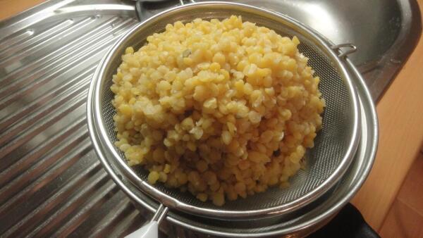 Сказано — сделано. Взял полкило дробленого… Нам-то все равно потом его молоть на растительный «фарш», а дробленый всяко сварится быстрее цельного. Взял полкило дробленого гороха, хорошенько промыл его, залил холодной водой с поправкой на будущее набухание (так, чтобы жидкость на палец-полтора была выше бобов) и на время отставил ёмкость с ним в сторонку.